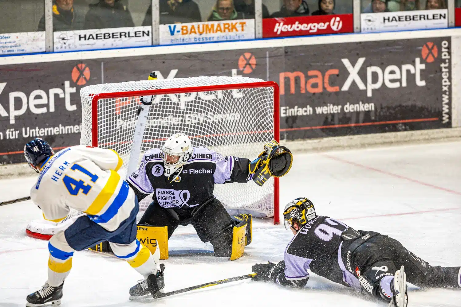 So startete auch das Mitteldrittel beim Stand von 0:0. Hier setzte Linden die Scheibe gleich an den Pfosten, Neudecker und Kaaz scheiterten ebenfalls knapp. In der Folge entwickelte sich ein offenes Spiel, in welchem nun auch die Rebels zu guten Chancen kamen. Ein schönes Solo von Julian Straub brachte kurz nach Hälfte der Partie aber die Füssener Führung, die auf Grund der Spielanteile verdient war. Eine Minute vor der Sirene hielt Timotej Pancur mit einer überragenden Parade die Führung fest. Lammel hatte das offene Toreck, aber der EVF-Goalie schaffte es doch noch, den Schuss zu blocken.